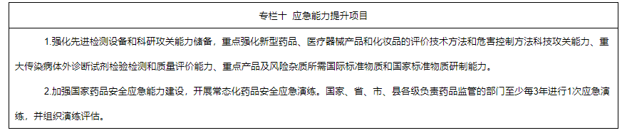 2.健全應(yīng)急管理制度機(jī)制。完善藥品安全事件應(yīng)急預(yù)案,健全應(yīng)急審評審批、檢驗(yàn)檢測、監(jiān)督檢查機(jī)制,完善藥品儲備和供應(yīng)制度。加強(qiáng)藥品檢驗(yàn)評價通用技術(shù)和關(guān)鍵技術(shù)研究,提升緊急情況下快速建立對新型藥品、醫(yī)療器械產(chǎn)品,特別是重大傳染病體外診斷試劑、疫苗、抗體藥物等檢驗(yàn)評價技術(shù)能力。