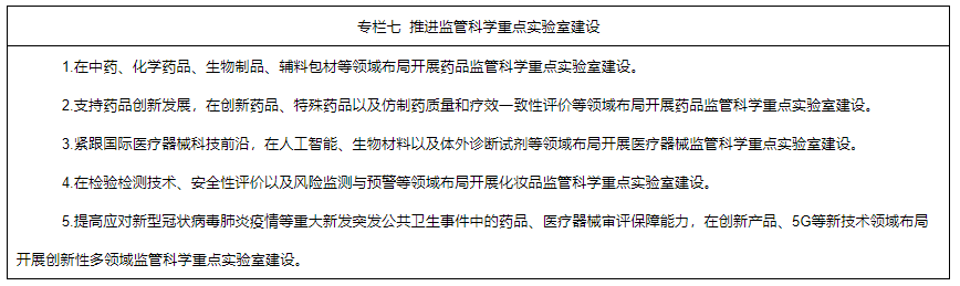 6.深入實(shí)施中國藥品監(jiān)管科學(xué)行動計(jì)劃。統(tǒng)籌推進(jìn)監(jiān)管科學(xué)研究基地和重點(diǎn)實(shí)驗(yàn)室建設(shè),開展監(jiān)管科學(xué)等研究。將藥品監(jiān)管科學(xué)研究納入國家相關(guān)科技計(jì)劃,重點(diǎn)支持中藥、疫苗、基因藥物、細(xì)胞藥物、人工智能醫(yī)療器械、醫(yī)療器械新材料、化妝品新原料等領(lǐng)域的監(jiān)管科學(xué)研究,加快新產(chǎn)品研發(fā)上市。支持國家審評、檢驗(yàn)、評價、核查等機(jī)構(gòu)參與國家相關(guān)科技項(xiàng)目,鼓勵開展藥品快速檢測新技術(shù)、藥品研發(fā)生產(chǎn)及質(zhì)量控制等研究,開展數(shù)字診療裝備、個體化診療產(chǎn)品、生物醫(yī)用材料的質(zhì)量評價、檢測技術(shù)及檢測規(guī)范等研究,開展化學(xué)藥品、疫苗、新型藥物和特殊藥物劑型等安全性、有效性評價技術(shù)以及創(chuàng)新醫(yī)療器械標(biāo)準(zhǔn)體系研究。鼓勵運(yùn)用現(xiàn)代科學(xué)技術(shù),結(jié)合我國傳統(tǒng)優(yōu)勢項(xiàng)目和特色植物資源,加強(qiáng)化妝品新原料研究。