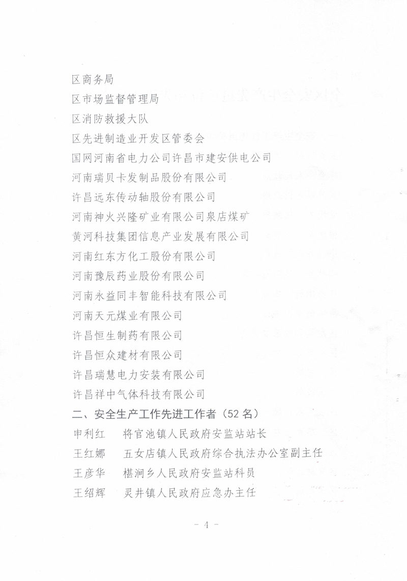 2021年,我公司以習(xí)近平新時(shí)代中國(guó)特色社會(huì)主義思想為指導(dǎo),全面貫徹落實(shí)黨的十九大精神,牢固樹(shù)立安全發(fā)展理念,嚴(yán)格落實(shí)安全生產(chǎn)“黨政同責(zé)、一崗雙責(zé)、齊抓共管、失職追責(zé)”,狠抓安全生產(chǎn)基層基礎(chǔ)建設(shè),排除潛在的安全隱患,保持了廠區(qū)安全生產(chǎn)形勢(shì)的總體穩(wěn)定。故許昌市建安區(qū)安全生產(chǎn)委員會(huì)對(duì)我公司在2021年度安全生產(chǎn)工作中的積極貢獻(xiàn)進(jìn)行了表彰,授予于“全區(qū)安全生產(chǎn)工作先進(jìn)單位”稱號(hào)。